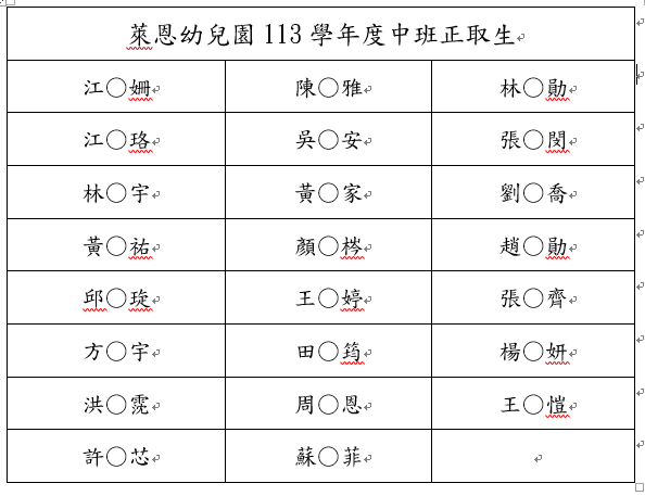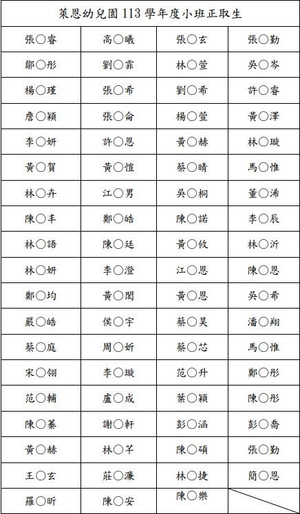 感謝家長熱烈的支持與愛護,以下為113學年度線上報名中小班正取名單